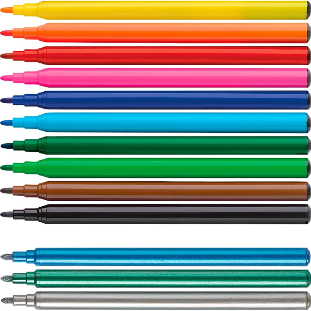 Descrição Características do Produto A Coleção Dinossauro acaba de aumentar! Chegou o estojo de Canetinhas Hidrográficas Dinossauro, são 10 cores + 3 cores com efeito metálico, perfeito para uso na escola e em casa. Além disso, acompanha uma cartela de adesivos e QR Code na embalagem com acesso a desenhos de dinossauro para colorir. É pura diversão!